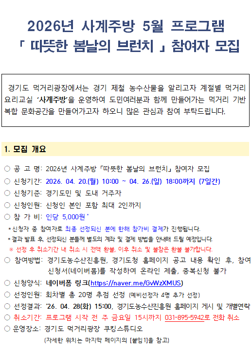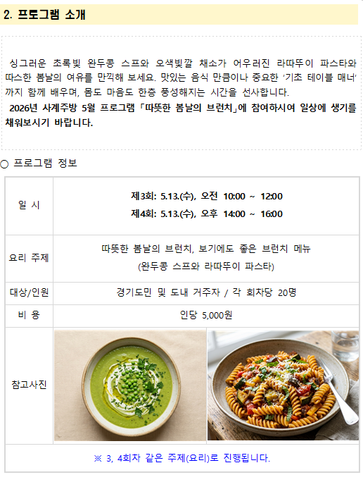 | 제목 | [공고 제2026-19호] 2026 사계주방 5월 프로그램「 따뜻한 봄날의 브런치 」참여자 모집 | ||