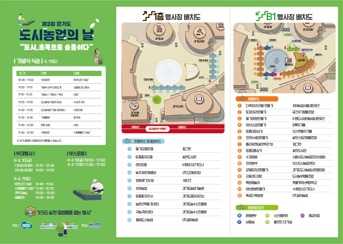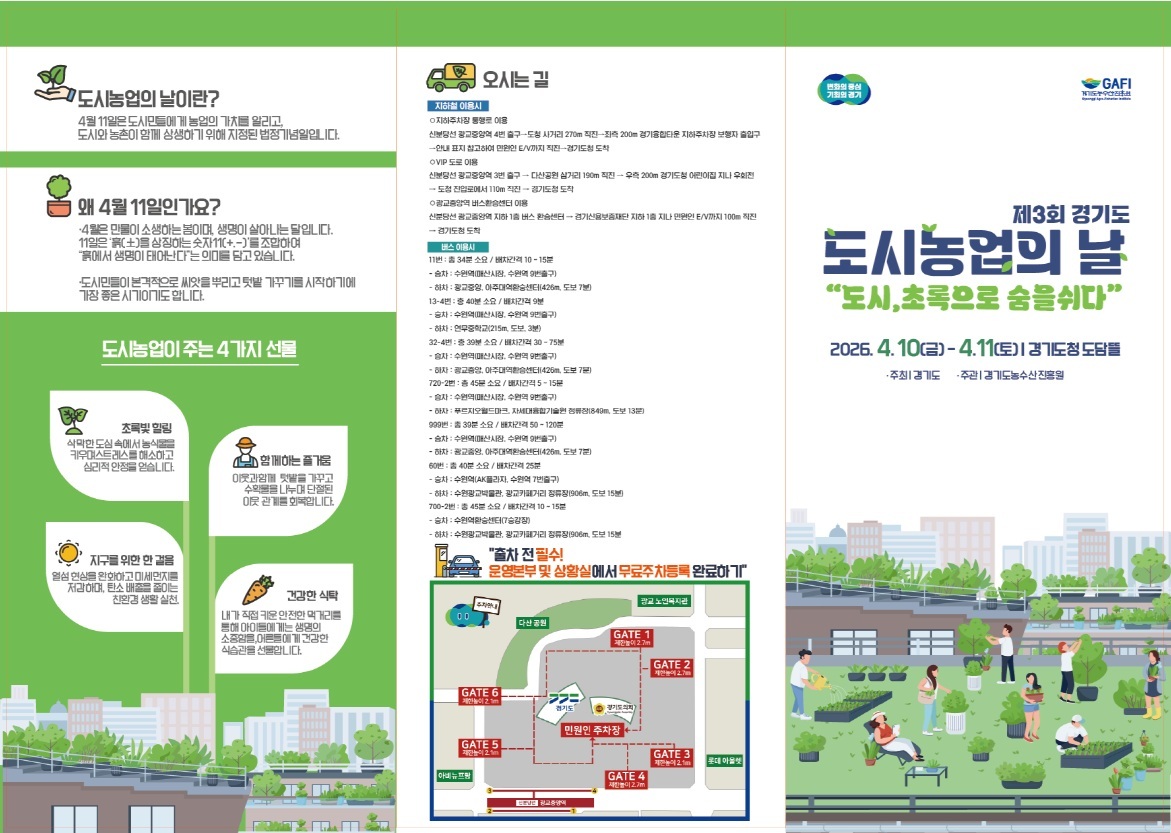 메인 컨텐츠 화면 지속가능한 미래를 만드는 농수산 플랫폼 기관 알림마당 공지사항채용입찰/공모묻고 답하기국민제안안전보건신문고당당신고센터당당신고센터성희롱성폭력 예방캠페인 알림마당 공지사항 공지사항 목록 화면 제목 [행사] 제3회 경기도 도시농업의 날 행사 글쓴이 경기도농수산진흥원 작성일 2026-04-03 첨부파일 제3회 경기도 도시농업의 날 개최 안내경기도와 경기도농수산진흥원은 도시농업의 가치 확산과 도민 참여 활성화를 위해「제3회 경기도 도시농업의 날」을 개최합니다.이번 행사는 ‘도시, 초록으로 숨을 쉬다’를 주제로 도시 속에서 자연을 경험하고, 농업과 일상이 연결되는 다양한 프로그램으로 운영됩니다.✔ 직접 만들어보는 체험 프로그램✔ 도시농업 전시·홍보 부스✔ 누구나 즐기는 공연과 이벤트- 일시: 2026. 4. 10.(금) ~ 4. 11.(토)- 장소: 경기도청 도담뜰✔ 메인 기념식 일정 ※ 자세한 내용은 아래 리플릿을 참고해주세요 목록