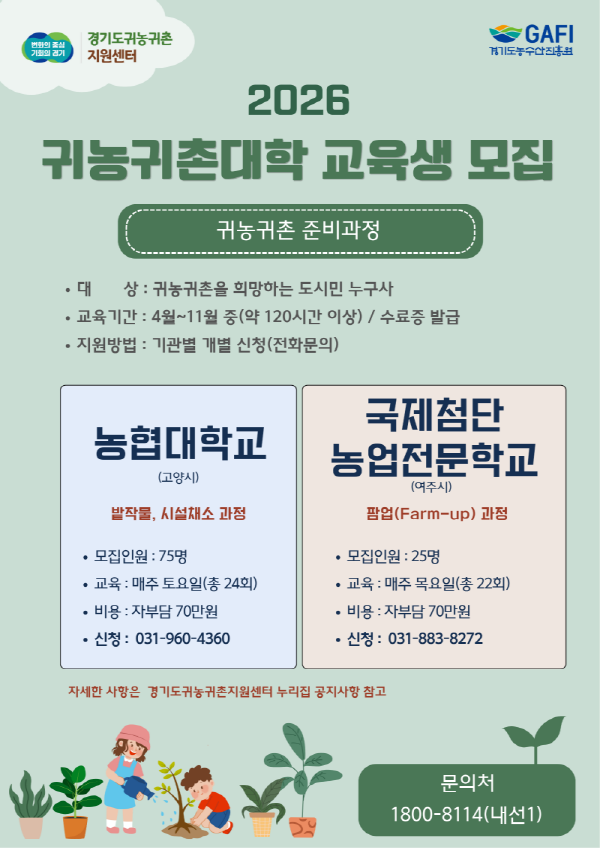 경기도귀농귀촌지원센터에서는 26년 경기귀농귀촌대학 교육생을 모집합니다.
