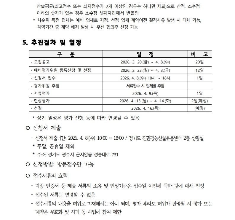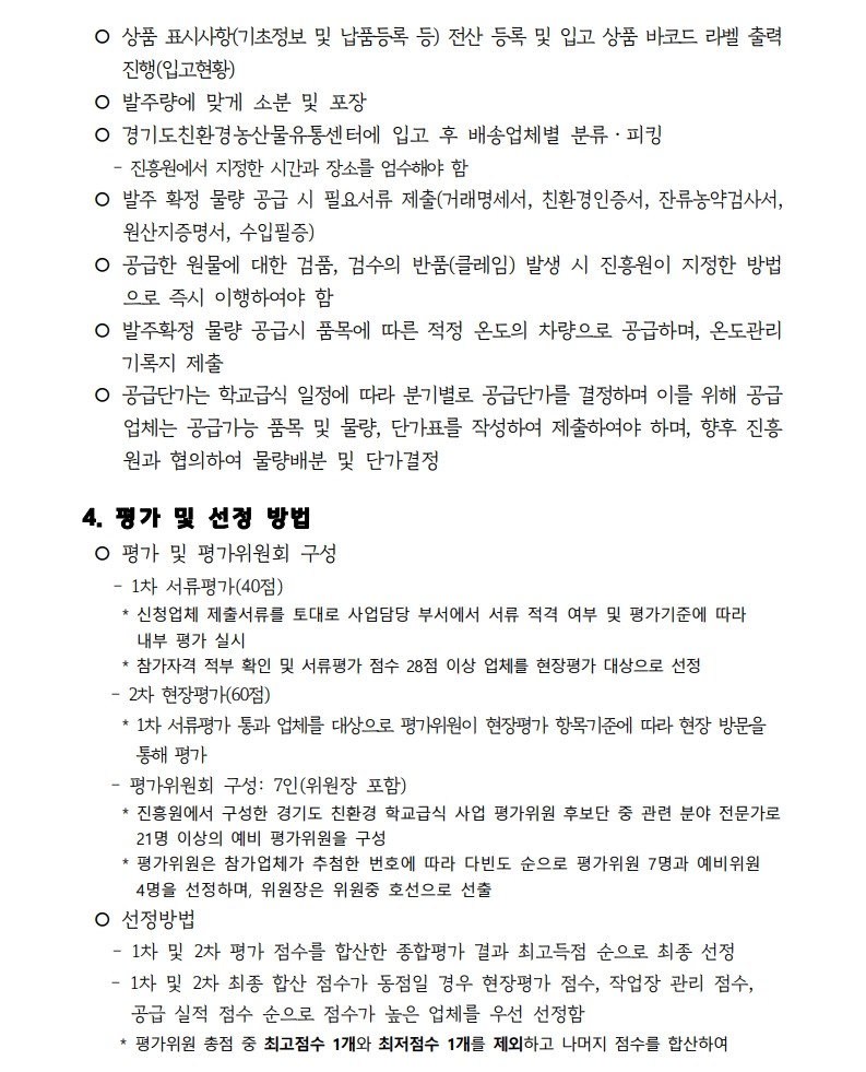 메인 컨텐츠 화면 지속가능한 미래를 만드는 농수산 플랫폼 기관 알림마당 공지사항채용입찰/공모묻고 답하기국민제안안전보건신문고당당신고센터당당신고센터성희롱성폭력 예방캠페인 알림마당 입찰/공모 입찰/공모 목록 화면 제목 [공고 제2026-011호] 2026년도 경기도 친환경 등 우수농산물 학교급식 지원사업 조각과일 공급업체 공개 모집(재공고) 글쓴이 경기도농수산진흥원 작성일 2026-03-20 첨부파일 2026년 농산물(조각과일) 공급업체 모집 공고문(재공고).hwp 목록