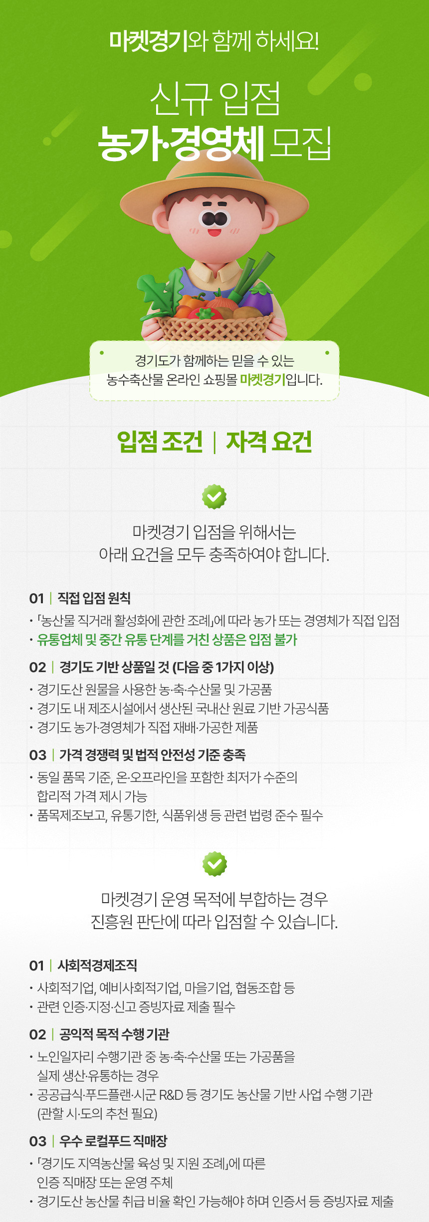 메인 컨텐츠 화면 지속가능한 미래를 만드는 농수산 플랫폼 기관 알림마당 공지사항채용입찰/공모묻고 답하기국민제안안전보건신문고당당신고센터당당신고센터성희롱성폭력 예방캠페인 알림마당 입찰/공모 입찰/공모 목록 화면 제목 마켓경기 원클릭 간편입점 신청안내 글쓴이 경기도농수산진흥원 작성일 2026-03-20 첨부파일 2026 마켓경기 관리 운영지침 전부개정안.hwp 목록
