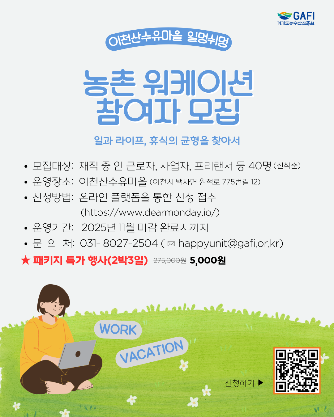 메인 컨텐츠 화면 지속가능한 미래를 만드는 농수산 플랫폼 기관 알림마당 공지사항채용입찰/공모묻고 답하기국민제안안전보건신문고당당신고센터당당신고센터성희롱성폭력 예방캠페인 알림마당 공지사항 공지사항 목록 화면 제목 [공고 제2025-63호] 농촌 워케이션 참여자 모집 글쓴이 경기도농수산진흥원 작성일 2025-09-24 첨부파일 목록