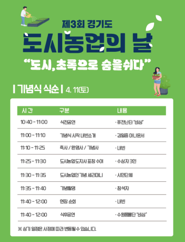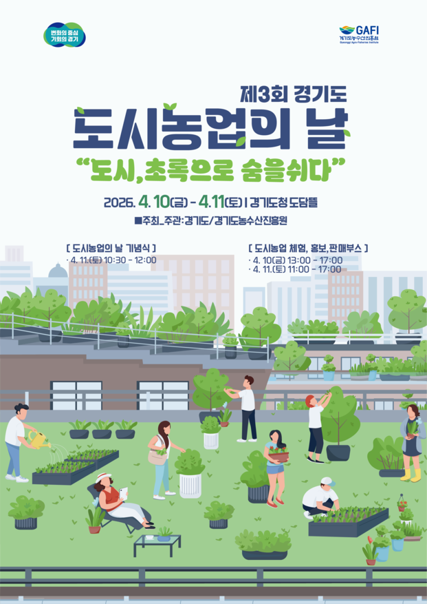메인 컨텐츠 화면 지속가능한 미래를 만드는 농수산 플랫폼 기관 알림마당 공지사항채용입찰/공모묻고 답하기국민제안안전보건신문고당당신고센터당당신고센터성희롱성폭력 예방캠페인 알림마당 공지사항 공지사항 목록 화면 제목 [행사] 제3회 경기도 도시농업의 날 행사 글쓴이 경기도농수산진흥원 작성일 2026-04-03 첨부파일 제3회 경기도 도시농업의 날 개최 안내경기도와 경기도농수산진흥원은 도시농업의 가치 확산과 도민 참여 활성화를 위해「제3회 경기도 도시농업의 날」을 개최합니다.이번 행사는 ‘도시, 초록으로 숨을 쉬다’를 주제로 도시 속에서 자연을 경험하고, 농업과 일상이 연결되는 다양한 프로그램으로 운영됩니다.✔ 직접 만들어보는 체험 프로그램✔ 도시농업 전시·홍보 부스✔ 누구나 즐기는 공연과 이벤트- 일시: 2026. 4. 10.(금) ~ 4. 11.(토)- 장소: 경기도청 도담뜰✔ 메인 기념식 일정 ※ 자세한 내용은 아래 리플릿을 참고해주세요 목록