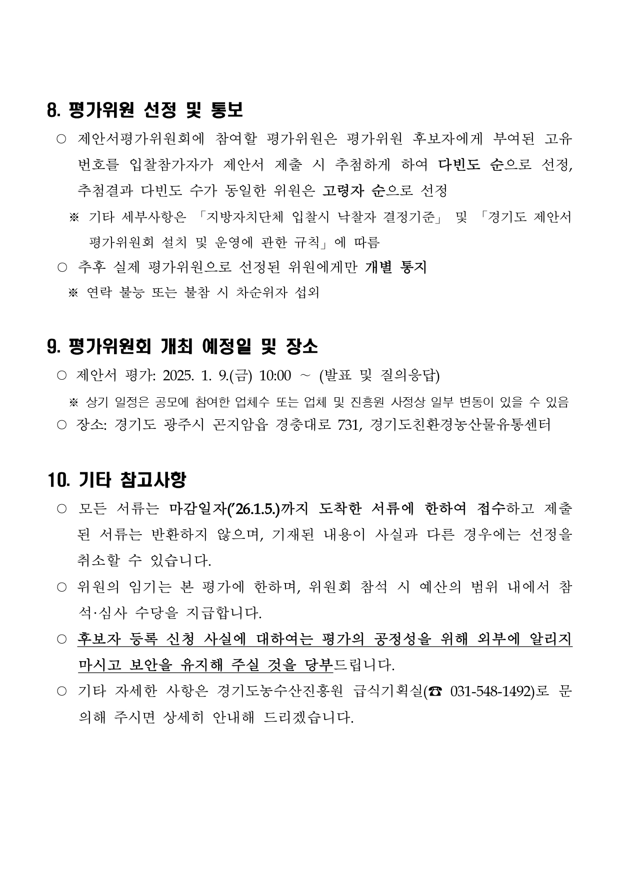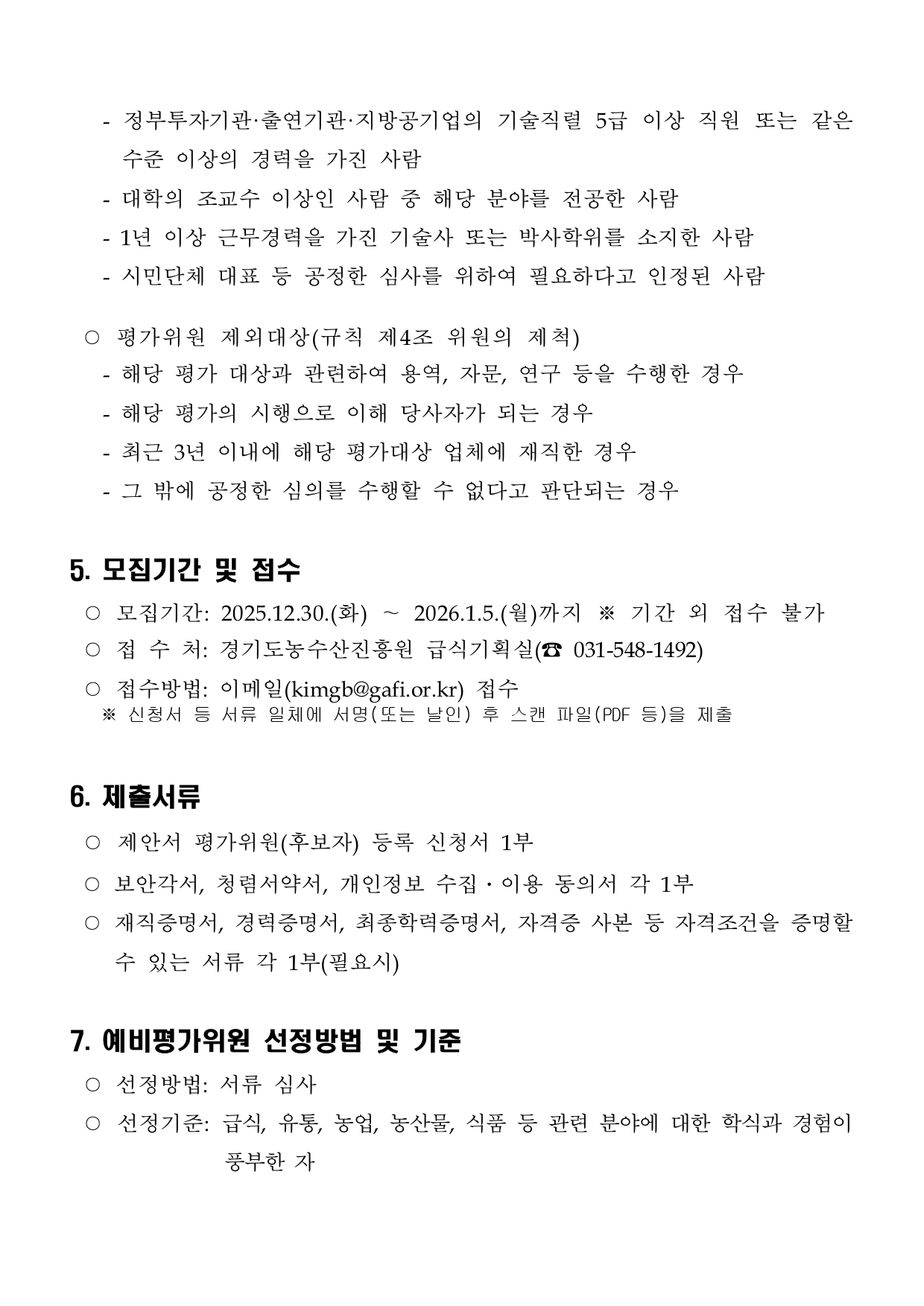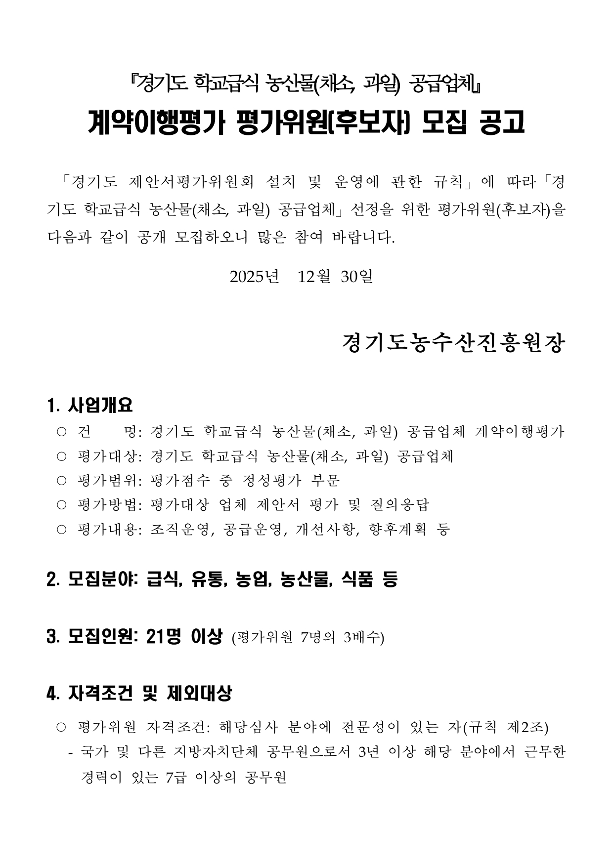 메인 컨텐츠 화면 지속가능한 미래를 만드는 농수산 플랫폼 기관 알림마당 공지사항채용입찰/공모묻고 답하기국민제안안전보건신문고당당신고센터당당신고센터성희롱성폭력 예방캠페인 알림마당 입찰/공모 입찰/공모 목록 화면 제목 2026년 경기도 친환경 학교급식 농산물(채소, 과일) 공급업체 선정 평가위원(후보자) 모집 공고 글쓴이 경기도농수산진흥원 작성일 2025-12-30 첨부파일 평가위원(후보자) 등록 신청서.hwp 목록