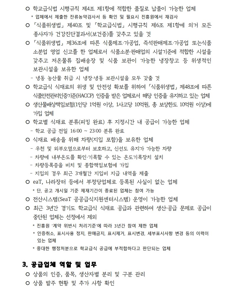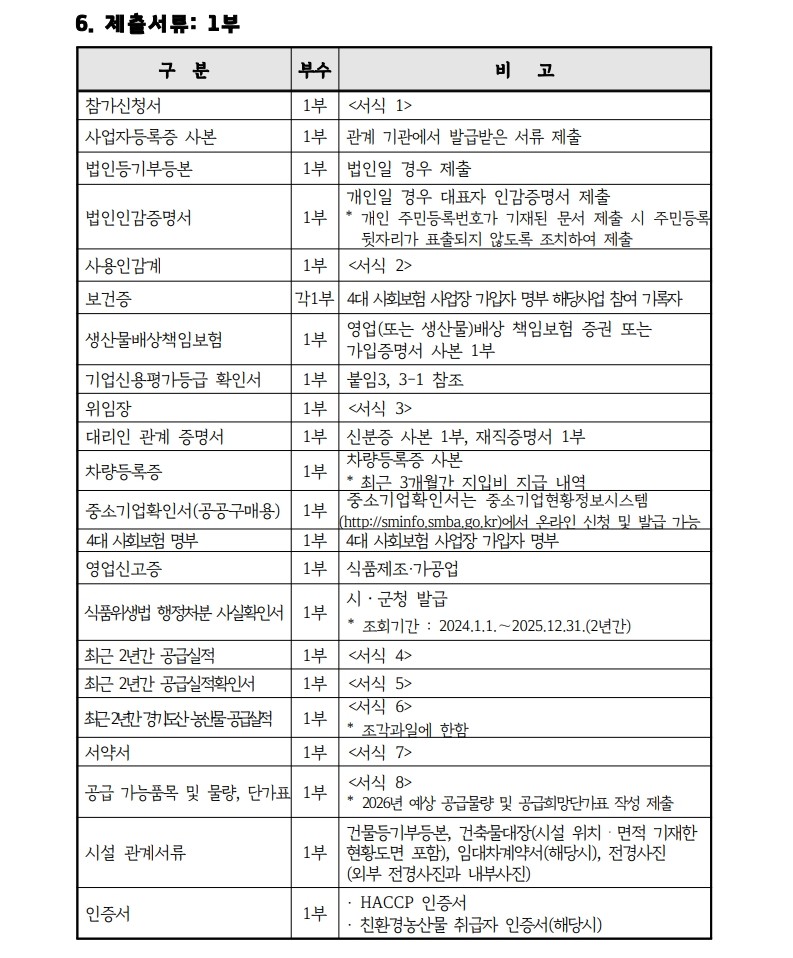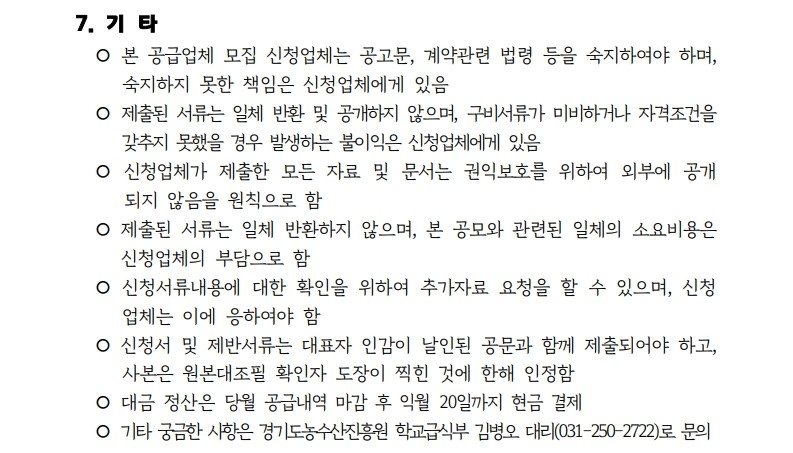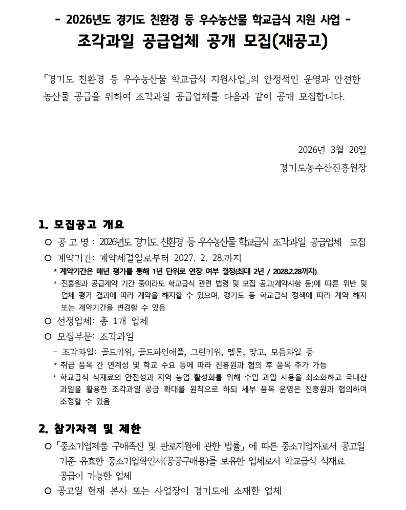 메인 컨텐츠 화면 지속가능한 미래를 만드는 농수산 플랫폼 기관 알림마당 공지사항채용입찰/공모묻고 답하기국민제안안전보건신문고당당신고센터당당신고센터성희롱성폭력 예방캠페인 알림마당 입찰/공모 입찰/공모 목록 화면 제목 [공고 제2026-011호] 2026년도 경기도 친환경 등 우수농산물 학교급식 지원사업 조각과일 공급업체 공개 모집(재공고) 글쓴이 경기도농수산진흥원 작성일 2026-03-20 첨부파일 2026년 농산물(조각과일) 공급업체 모집 공고문(재공고).hwp 목록