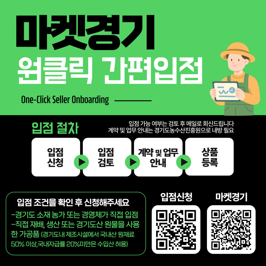 메인 컨텐츠 화면 지속가능한 미래를 만드는 농수산 플랫폼 기관 알림마당 공지사항채용입찰/공모묻고 답하기국민제안안전보건신문고당당신고센터당당신고센터성희롱성폭력 예방캠페인 알림마당 입찰/공모 입찰/공모 목록 화면 제목 마켓경기 원클릭 간편입점 신청안내 글쓴이 경기도농수산진흥원 작성일 2026-03-20 첨부파일 2026 마켓경기 관리 운영지침 전부개정안.hwp 목록